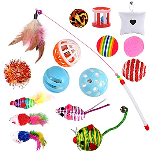 • Contiene 16 Giocattoli: Bacchetta di piume con campane, giocattolo del mouse e palline di vari colori, campane carosello, palle campane, catnip etc. Non tossico, sicuro da usare.